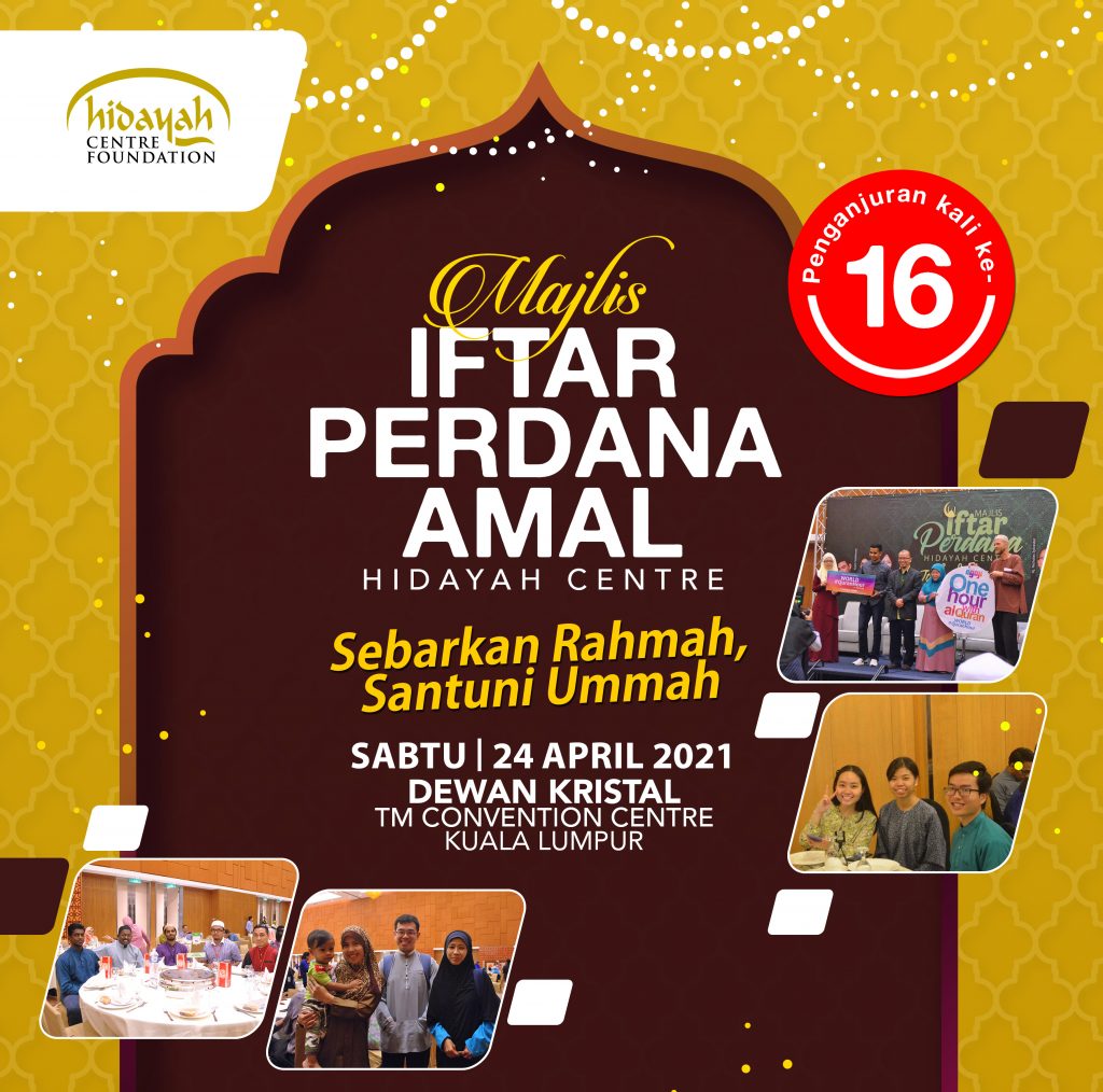 Hidayah Centre Foundation buat kali ke-16 akan meraikan 250 orang mualaf serta ahli keluarga mereka (termasuk yang belum Islam) dalam Majlis Iftar Perdana Amal Hidayah Centre (MIPHC) 2021. Kami membuka peluang TAJAAN dan PEMBELIAN MEJA/KERUSI bagi majlis berbuka puasa kali ini!